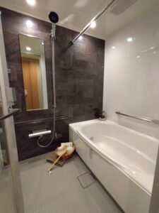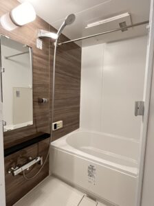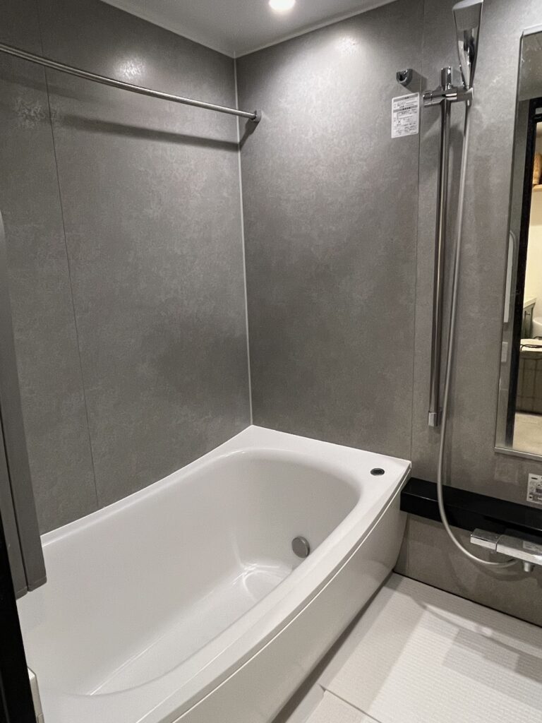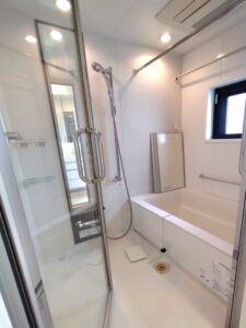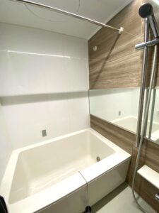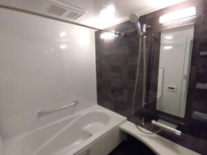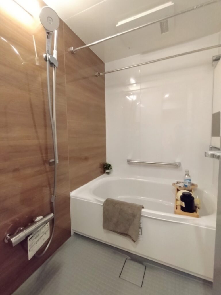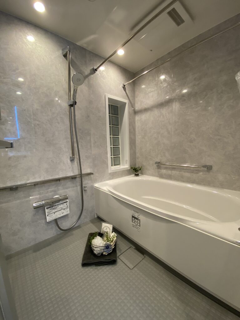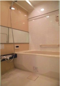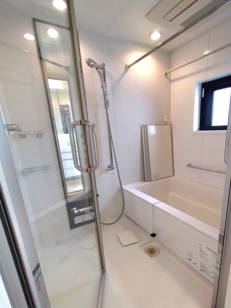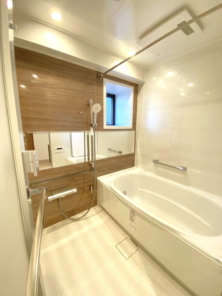 自動追い焚き機能・浴室乾燥機付です。床はキレイサーモフロアでお掃除がしやすく寒い冬でも足元が冷たくなりにくいのが特長です。