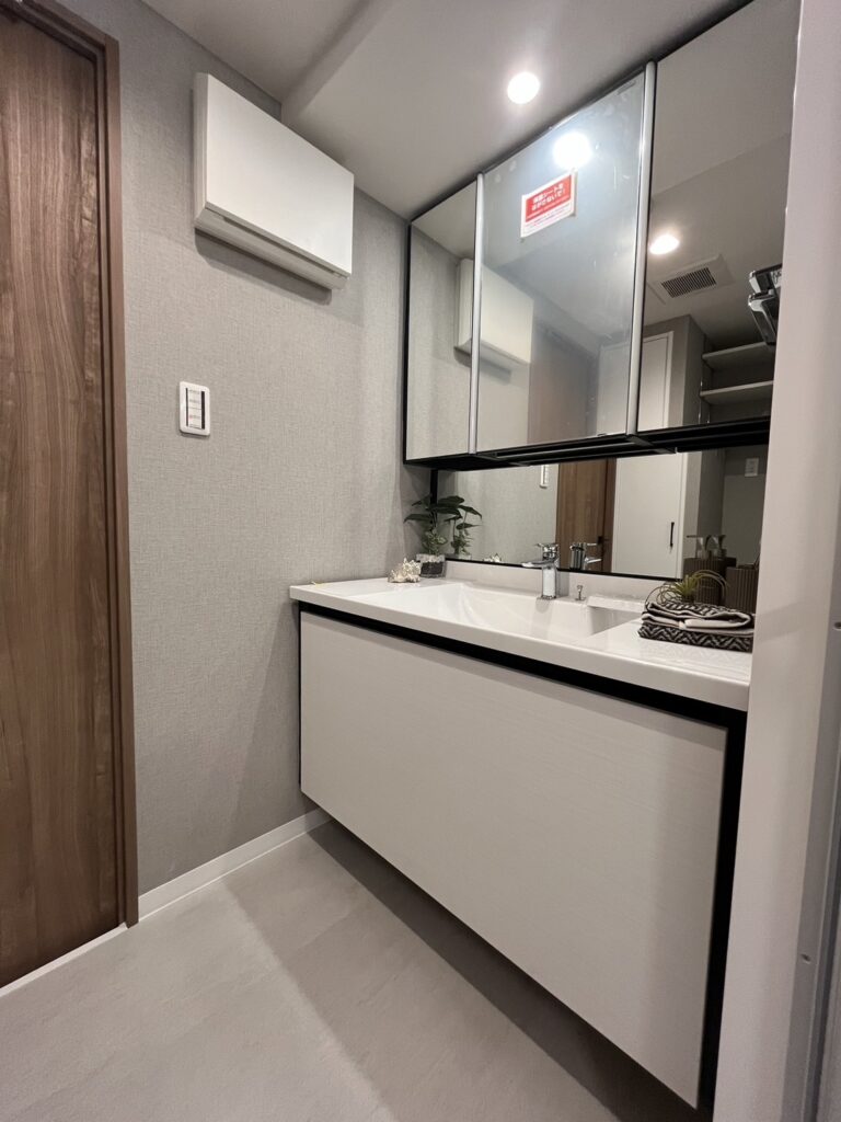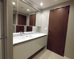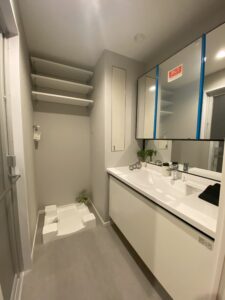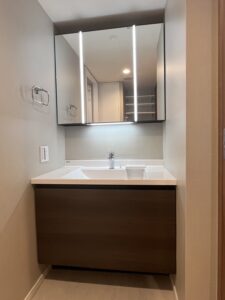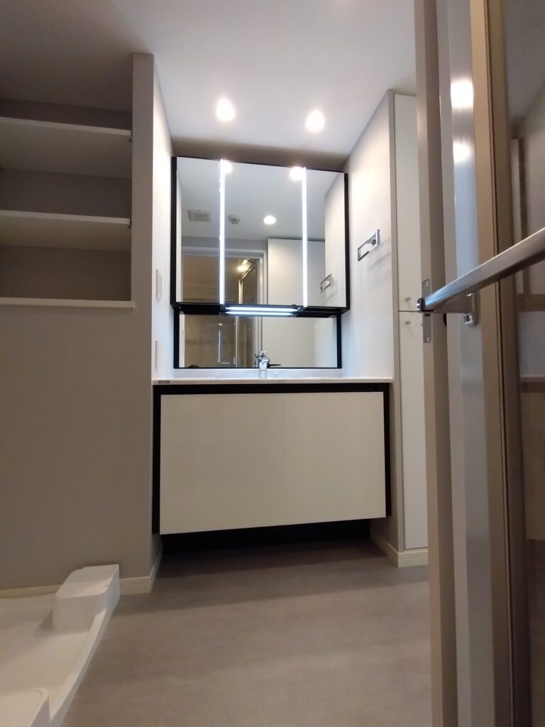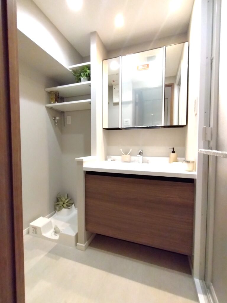 洗面台下や鏡面裏のキャビネット、洗濯機置場の横など収納がたっぷりです。