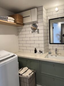 洗面台の隣の洗濯機置場には上部に可動棚を設け、水回りを集約し使い勝手抜群の洗面室にしています。