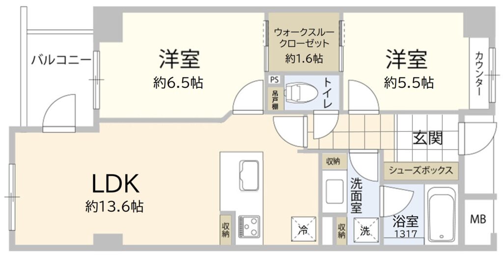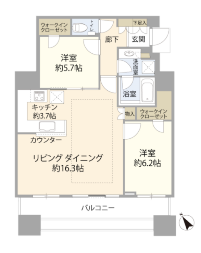 53平米、住宅取得控除利用可能。南向きの明るく開放感のある2LDK