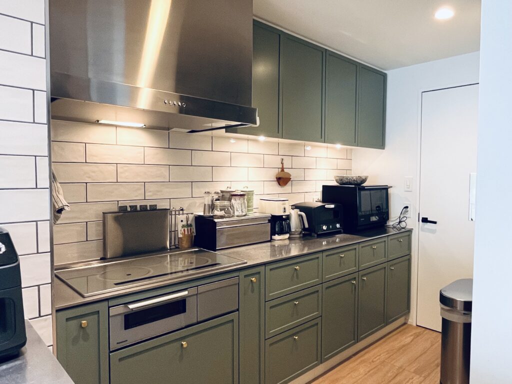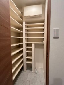 収納もたっぶりで、背の高いストック品や深い鍋などは下へ収納可能です。