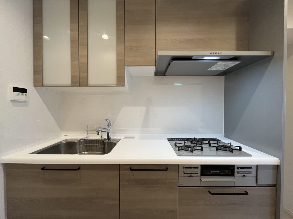 3口のガスコンロはお手入れのしやすいガラストップ。